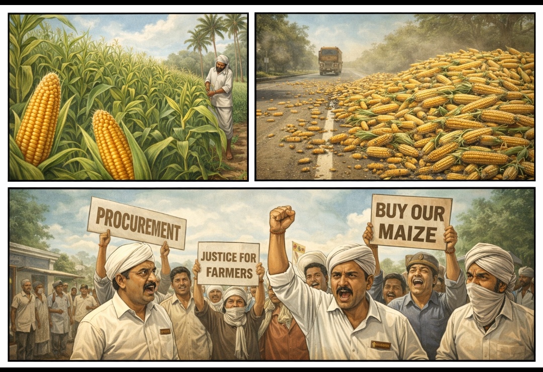 ఈ సందర్భంగా ఆందోళనలో ఉన్న రైతులు మాట్లాడుతూ తమ ఆవేదనను వెలిబుచ్చారు. గత 20 రోజులుగా మొక్కజొన్న కోతలు పూర్తయి ధాన్యం రోడ్లపైనే కుప్పలుగా పేరుకుపోయిందని తెలిపారు.భానుడి ప్రతాపానికి ధాన్యంలో తేమ తగ్గి బరువు తగ్గిపోతోందని, మరోవైపు ఆకస్మికంగా కురుస్తున్న వర్షాలకు మక్కలు తడిసి ముద్దవుతున్నాయని రైతులు వాపోయారు.