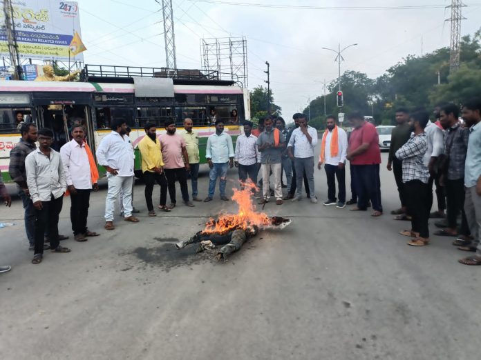 ఆద్వర్యంలో శనివారం ధర్నా చౌక్ వద్ద మాజీ ముఖ్యమంత్రి వైఎస్ జగన్మోహన్ రెడ్డి దిష్టి బొమ్మ దహనం చేశారు. వారు మాట్లాడుతూ..గత వైసీపీ ప్రభుత్వ హాయంలోనే భక్తుల మనోభావాలు దెబ్బతీసేలా ఈ వ్యవహారం నడిచిందని ఆగ్రహం వ్యక్తం చేశారు.