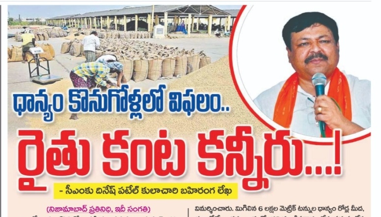 జిల్లాలో ధాన్యం కొనుగోలు ప్రక్రియ అస్తవ్యస్తంగా తయారైందని, ప్రభుత్వం తక్షణమే స్పందించి కొనుగోళ్లు చేపట్టాలని బీజేపీ జిల్లా అధ్యక్షులు దినేష్ పటేల్ కులాచారి డిమాండ్ చేశారు. ఈ మేరకు ఆయన సోమవారం రాష్ట్ర ముఖ్యమంత్రికి ఒక బహిరంగ లేఖ రాశారు.