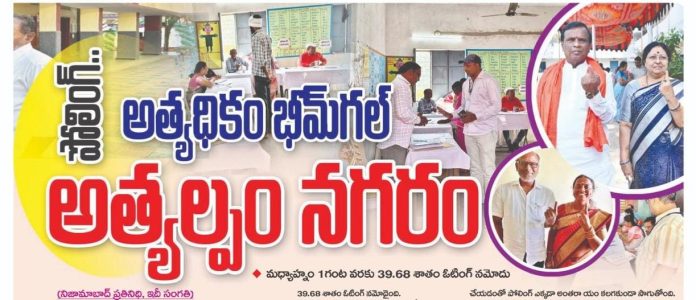 మధ్యాహ్నం 1 గంట వరకు అందిన సమాచారం ప్రకారం.. జిల్లా వ్యాప్తంగా సగటున 39.68 శాతం ఓటింగ్ నమోదైంది. నిజామాబాద్ కార్పొరేషన్: 35.49%, ఆర్మూర్ మున్సిపాలిటీ: 47.93%, బోధన్ మున్సిపాలిటీ: 50.69%, భీమ్గల్ మున్సిపాలిటీ: 51.53% ఓటింగ్ నమోదయ్యింది.