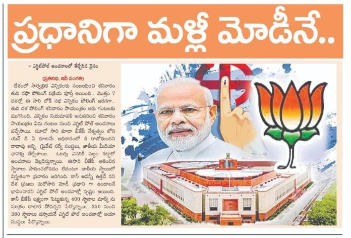 తుది దశ పోలింగ్ శనివారం సాయంత్రం ఆరు గంటలకు ముగిసింది. ఎన్నికలనియమావళి అనుసరించి శనివారం సాయంత్రం ఏడు గంటల నుంచి ఎగ్జిట్ పోల్ అంచనాలు వచ్చేసాయి. మూడో సారి కూడా బీజేపీ నేతృత్వంలోని యన్ డి ఏ కూటమే అధికారంలో కి రాబోతుందని దాదాపు అన్ని ప్రైవేట్ సర్వే సంస్థలు, జాతీయ మీడియా ఛానెళ్లు తేల్చేశాయి.