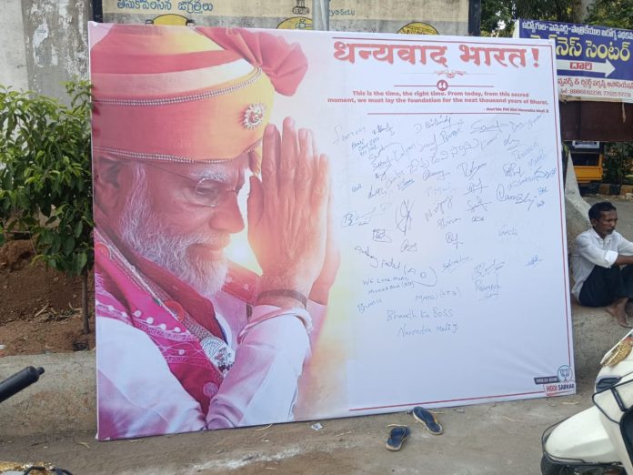 నిజామాబాద్ నగరంలో ప్రధాని మోడీ తనను మూడో సారి గెలిపించినందుకు దేశ ప్రజలు ధన్యవాదాలు తెలుపుతున్నట్లు గా ఓ ఫ్లెక్సీ ని నిజామాబాద్ నగరంలో పలు చౌరస్తాలో వెలిసాయి.