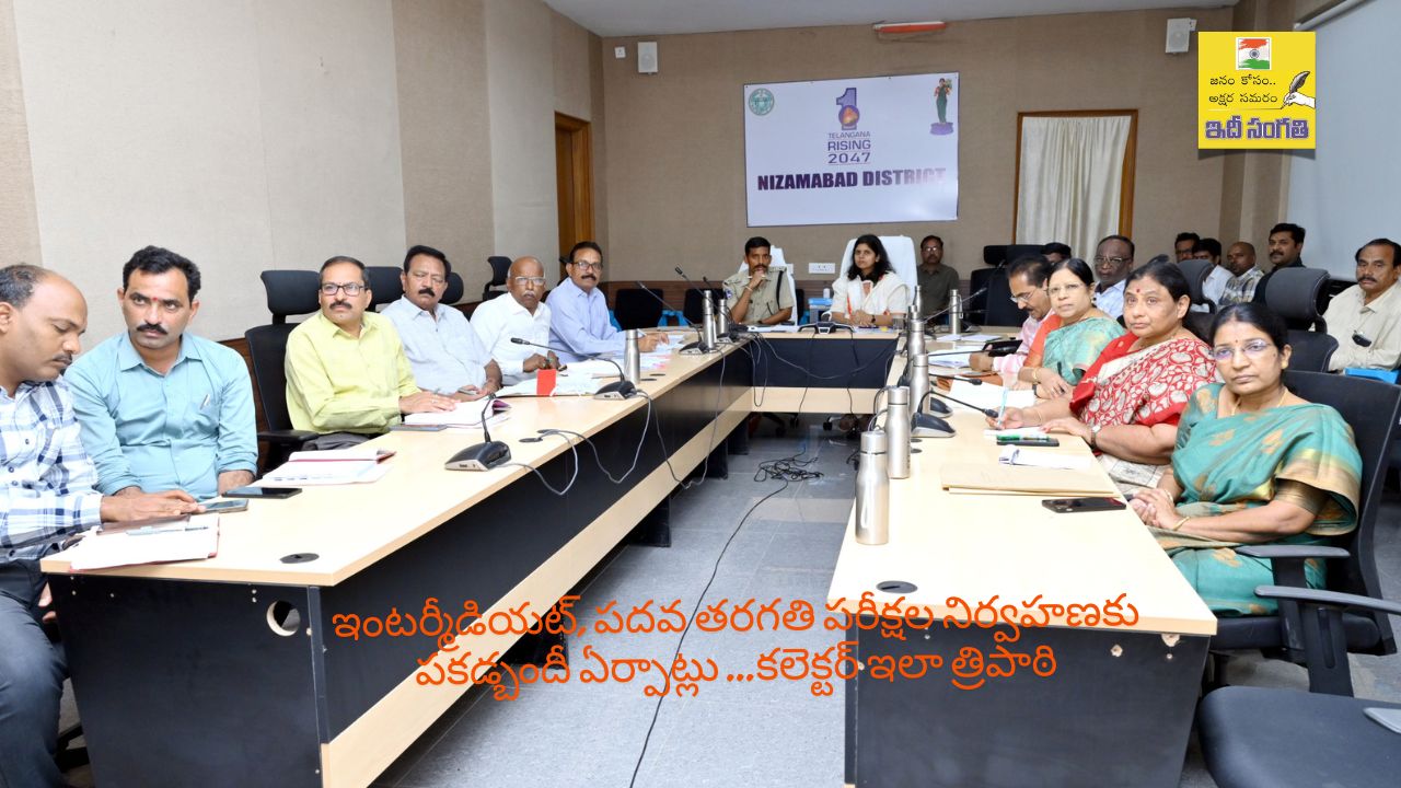 నిజామాబాద్, ఫిబ్రవరి 24 : జిల్లాలో ఇంటర్మీడియట్, పదవ తరగతి వార్షిక పరీక్షలను సమర్థవంతంగా నిర్వహించేందుకు పకడ్బందీ ఏర్పాట్లు చేశామని కలెక్టర్ ఇలా త్రిపాఠి తెలిపారు. పరీక్షల నిర్వహణ ఏర్పాట్లపై మంగళవారం హైదరాబాద్ నుండి రాష్ట్ర ప్రభుత్వ ప్రధాన కార్యదర్శి రామకృష్ణారావు సంబంధిత అన్ని జిల్లాల కలెక్టర్లతో, పోలీస్ కమిషనర్లు, ఎస్పీలతో వీడియో కాన్ఫరెన్స్ ద్వారా సమీక్షించారు.