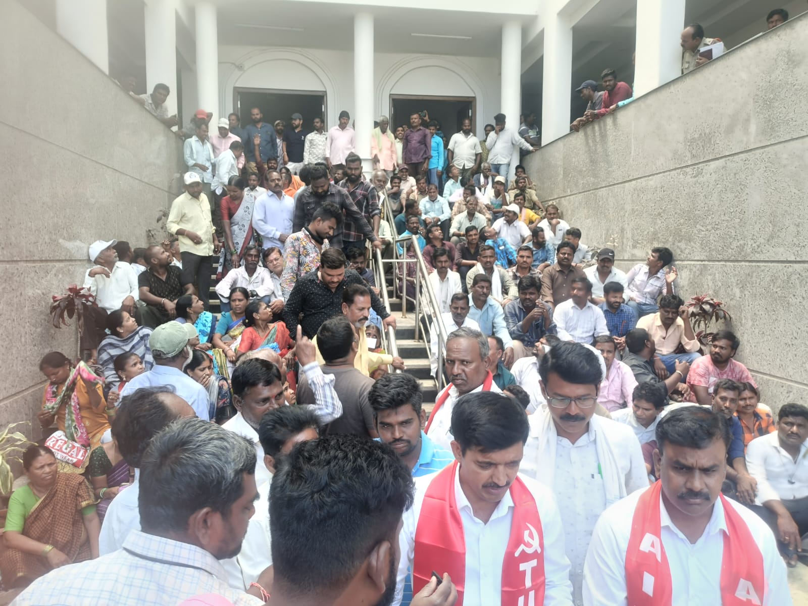 ఈ క్రమంలో మాధవి, పార్వతి అనే మహిళా కార్మికులు ఒక్కసారిగా సొమ్మసిల్లి పడిపోయారు. తోటి కార్మికులు వారికి సపర్యలు చేసి, వెంటనే అంబులెన్స్లో ప్రభుత్వ ఆసుపత్రికి తరలించారు. ఈ కార్యక్రమంలో యూనియన్ నాయకులు పాల్గొన్నారు.